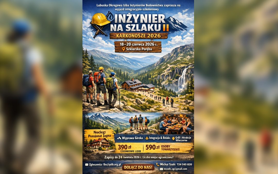 Lubuska Okręgowa Izba Inżynierów Budownictwa zaprasza na drugą edycję wyjazdu integracyjno-szkoleniowego „Inżynier na Szlaku II”, który odbędzie się w dniach 18–20 czerwca 2026 r. w Karkonoszach.